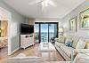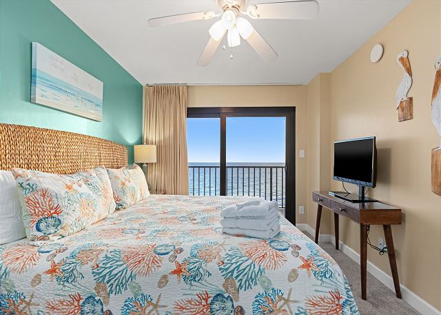 Upon entering this gorgeous condo, you’ll find a fully equipped kitchen to your right, complete with a washer and dryer for your convenience. Down the hall, the dining and living areas open up, featuring a comfortable seating area and a flat-screen Smart TV. The bedroom offers a luxurious King bed, its own flat-screen Smart TV, and a private bathroom with a shower. Step out onto the balcony, furnished with chairs, and take in the breathtaking sunsets over the beach.