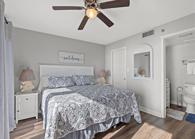 Primary Bedroom: King bed, Smart TV, private bath with newly remodeled walk-in shower